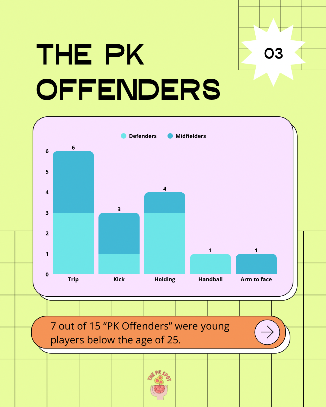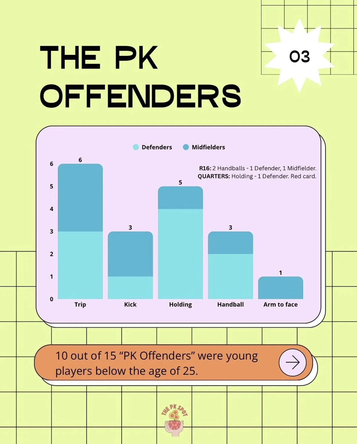 Defenders committed the most fouls leading to PKs to no real surprise, but midfielders committed a significant amount (2 less than defenders).
